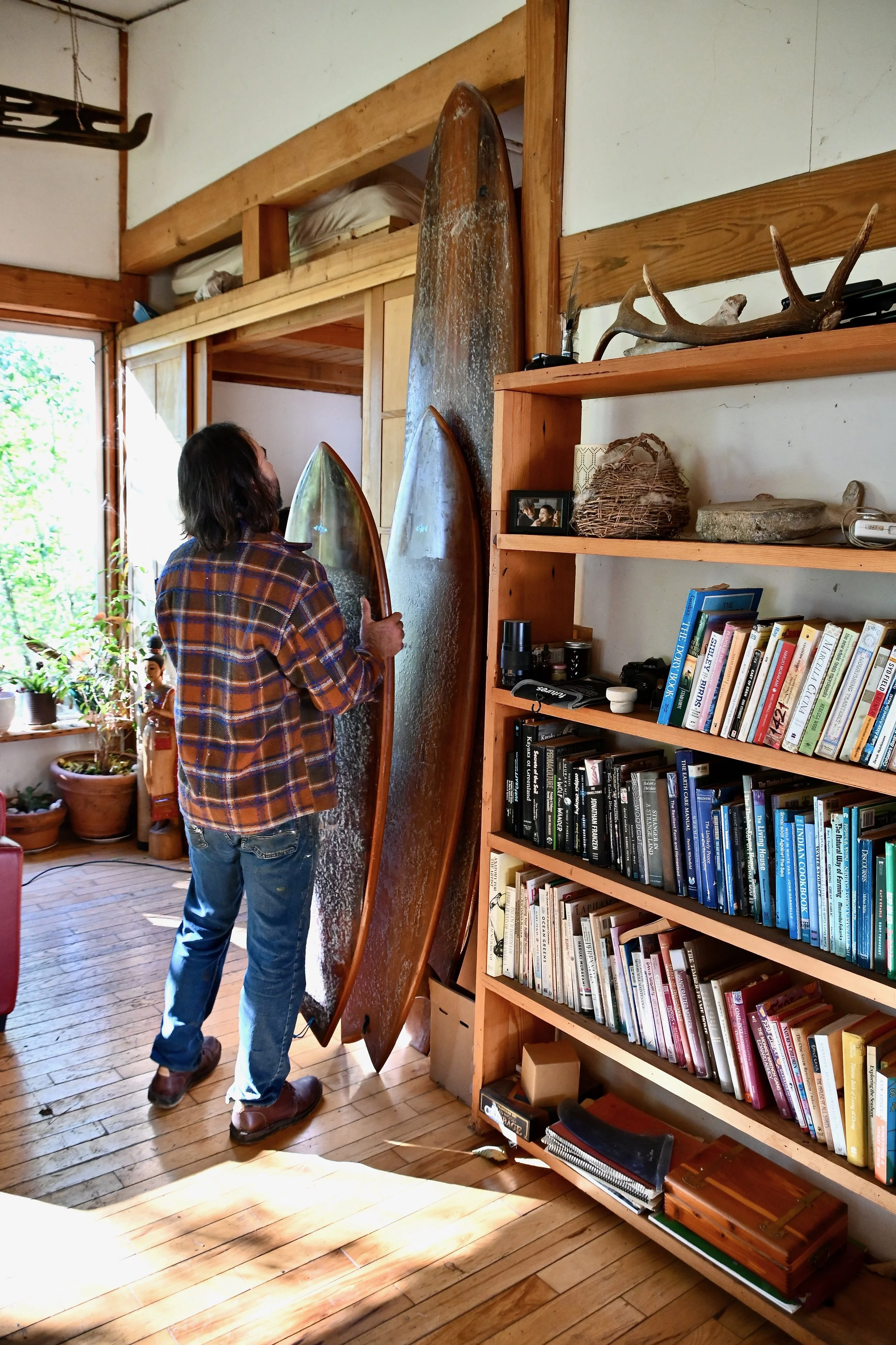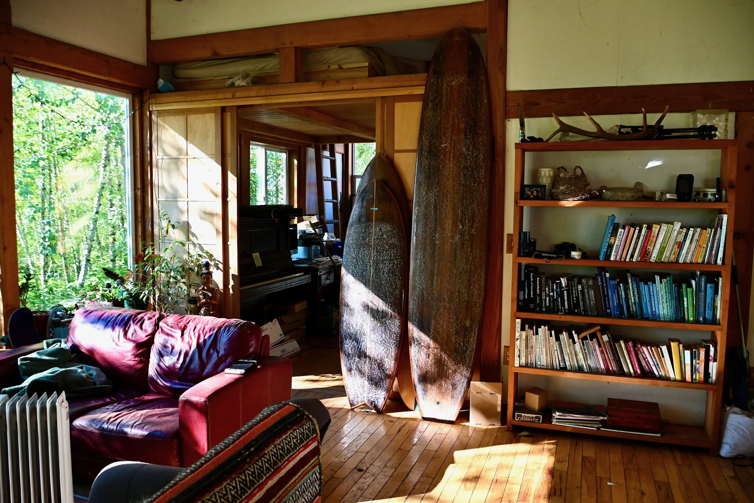 Henry is a carpenter and builds wooden surfboards in his spare time. The boards are built primarily from cedar with some mahogany and redwood to add some color contrast. The board he handed me was a short, fish design. It was 5’8” and light as a feather. I loved the outline and told him so. He smiled and was happy to have some feedback on his beautiful creation. He invited me inside and I walked with the board in my arms to the front door and went inside. The house was a warm place that was heated by a wood stove. Again, the view was huge and beautiful. The entire front was all glass save the framing it took to keep the huge panes in place. My eyes followed the beach until my focus turned to the other boards stacked up along a wall beside me.