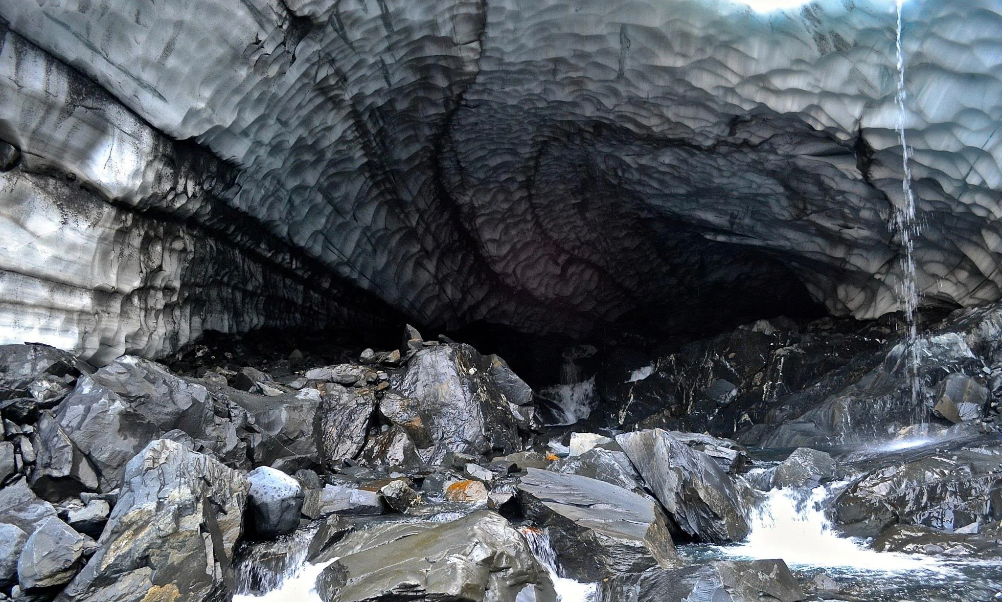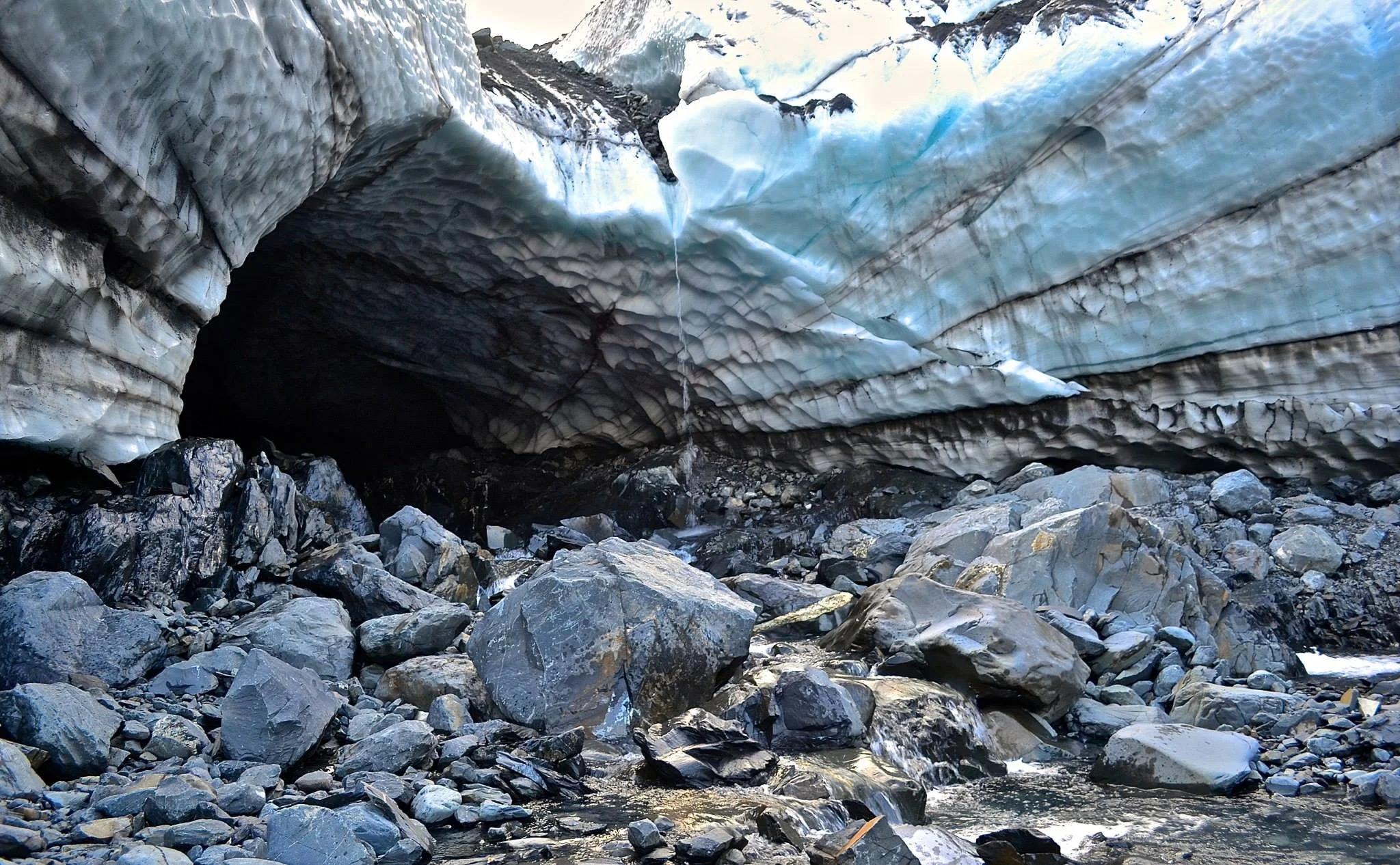 Approaching the hole, I could see that it led to an underground ice tunnel. The opening was big enough to fit a home inside of it. Large boulders led to the entrance and even they looked small when compared to the cave’s entrance. I stood before it and looked inside. I could see the river pouring from it and water was raining down inside of the cave from the glacial ceiling above.
